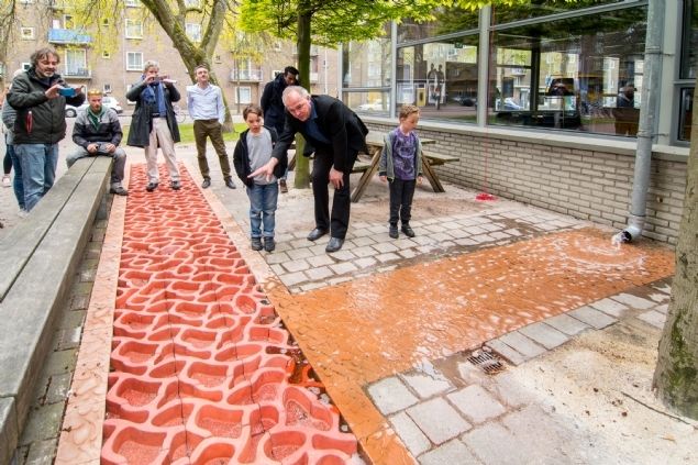 Afwateringssysteem en riolering lijken vaak niet meer in staat om de grote hoeveelheden hemelwater op te vangen en af te voeren. Daarom wordt in de openbare ruimte naar andere manieren gezocht, zoals de Rain(a)way-watertegel van het gelijknamige ontwerpbureau.