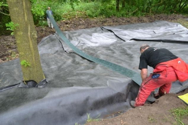 Het is de eerste locatie in Nederland waar deze proef wordt opgezet. Woensdag werd in opdracht van Donkergroen - verantwoordelijk voor het onderhoud in Zeewolde - door aannemer Bezee gestart met het graven van een geul van circa 50 centimeter om het stuk grond. Hierbij is het belangrijk dat alle vervuilde grond op het af te dekken gebied wordt gelegd. Vervolgens worden de rollen Dupont Plantex Platinium uitgerold tot in de geul. Met smallere rollen gemaakt van hetzelfde materiaal worden de naden vastgelijmd, na het eerst aan elkaar genaaid te hebben. Dit om de kwaliteit van de uiteindelijke naad te verbeteren. De lijm is door het bedrijf Henko ontwikkeld en aangepast op gebruik in de natuur.