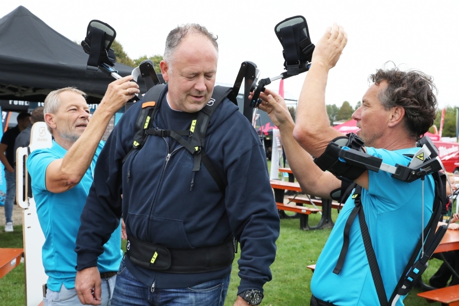 | Zelf kijken of een exoskelet wat voor je was, kon ook. De aanwezigen leveranciers op het exoskelettenplein waren: SpanSet, Skelex, ExoSustain, Laevo en De Wild. |