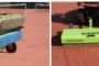 Kleine kunstgrasreiniger manouvreert tussen speeltoestellen