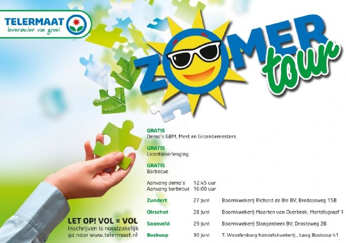 Na 27 juni vinden bijeenkomsten plaats bij Boomkwekerij Maarten van Overbeek in Oirschot (28 juni), Boomkwekerij Slangenbeek te Saasveld (29 juni) en T. Wezelenburg handelskwekerij te Boskoop (30 juni). Geïnteresseerden wordt verzocht zich in te schrijven via de site van Telermaat.