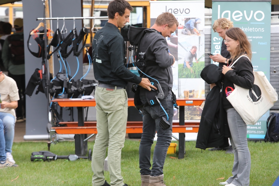 | Zelf kijken of een exoskelet wat voor je was, kon ook. De aanwezigen leveranciers op het exoskelettenplein waren: SpanSet, Skelex, ExoSustain, Laevo en De Wild. |