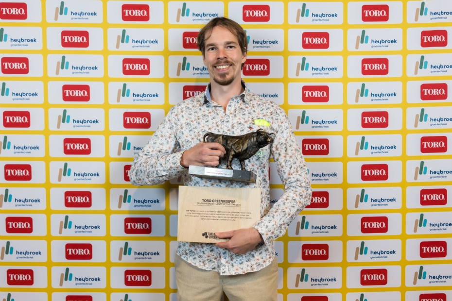 Bij de uitverkiezing tot Toro Greenkeeper Student of the Year hoort naast een mooi beeld van de Toro-stier een betaalde stage in het buitenland. 'Dat is natuurlijk een heel mooie prijs, maar het past helaas nu niet goed in mijn privéleven. Ik word namelijk vader en na de geboorte wil ik de komende tijd niet vier weken van huis zijn.' Thuis wordt hij sowieso elke dag herinnerd aan de behaalde titel Toro Greenkeeper Student of the Year, want de stier krijgt een mooie plek op zijn werkkamer.